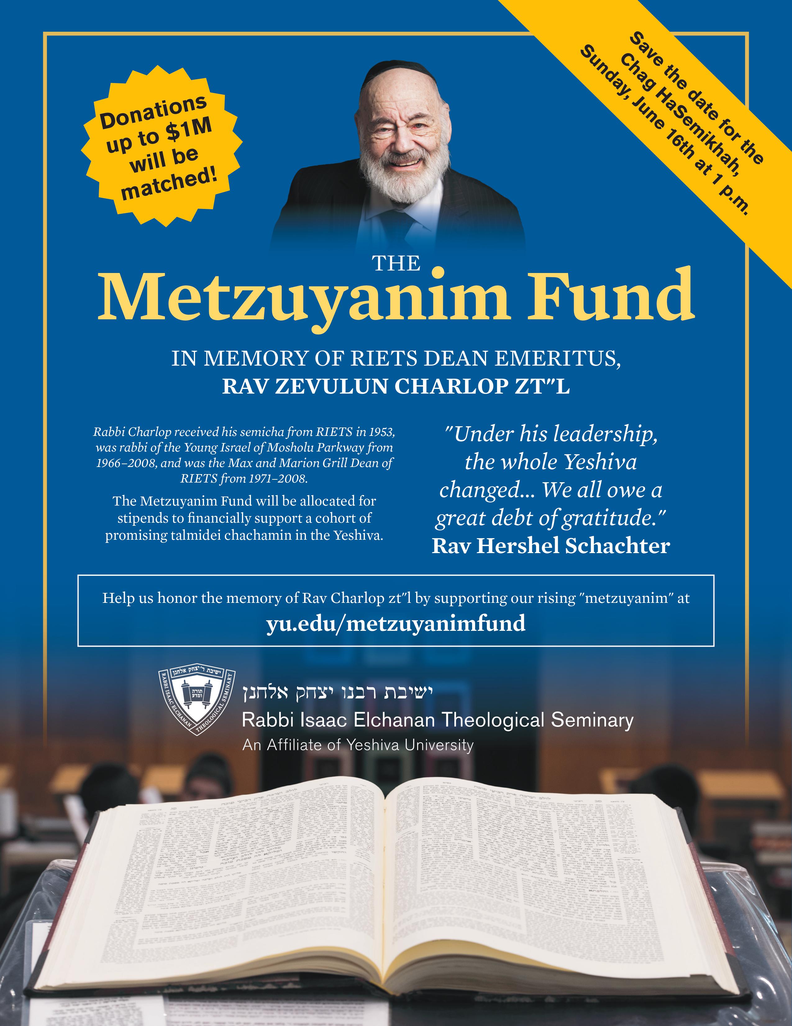 Our Dean Emeritus, Rabbi Zevulun Charlop Zt"l, was a pillar of the RIETS community for decades and aided countless talmidim (or, as he would say, "metzuyanim") on their path to becoming rabbanim. As we prepare to celebrate the Chag HaSemikhah, we are privileged to establish the Metzuyanim Fund in his memory to financially support a yearly cohort of promising talmidei chachamim learning in our kollel. Thanks to a generous donor, contributions will be matched up to $1 million! Please consider supporting our rising metzuyanim in order to continue the tradition of excellence and success in learning that Rabbi Charlop embodied. Donations can be made at https://ar.2jryb.shop/MetzuyanimFund